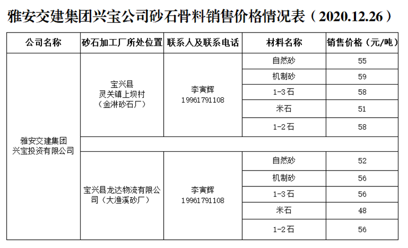 ÑŰ²½»½¨¼¯ˆFÅdŒš¹«Ë¾É°Ê¯¹ÇÁÏäNÊÛƒr¸ñÇé›r±í£¨2020.12.26£©
