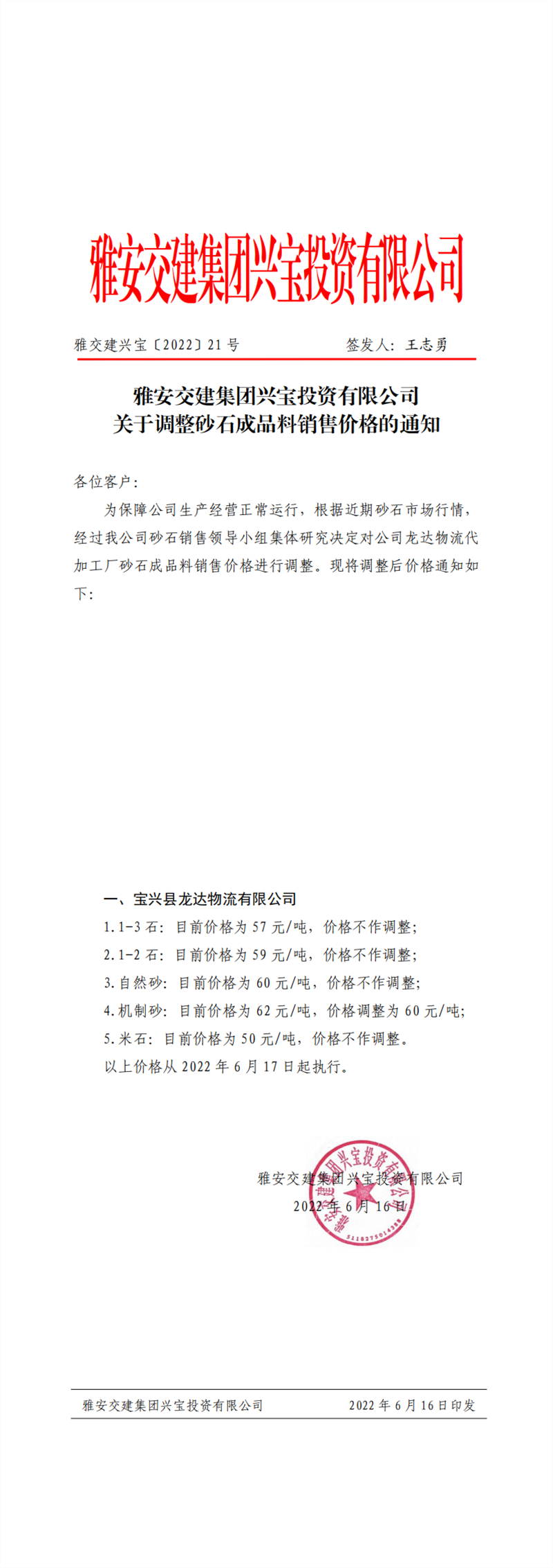 雅安交建集團(tuán)興寶投資有限公司 關(guān)于調(diào)整砂石成品料銷(xiāo)售價(jià)格的通知(2022.6.16)