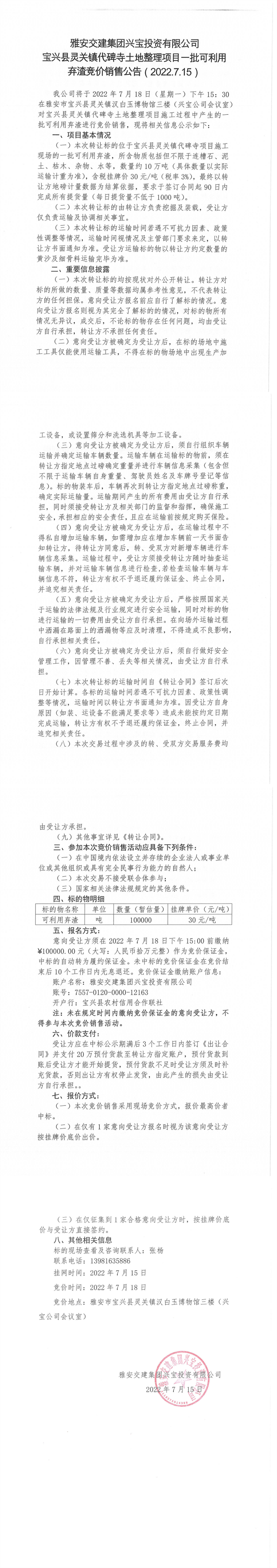 寶興縣靈關(guān)鎮(zhèn)代碑寺土地整理項(xiàng)目一批可利用棄渣競(jìng)價(jià)銷售公告7.15(10萬(wàn)噸)