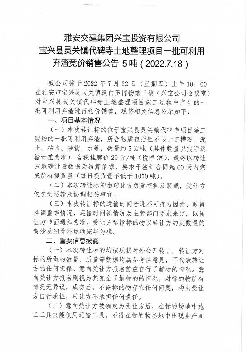 寶興縣靈關(guān)鎮(zhèn)代碑寺土地整理項目一批可利用棄渣競價銷售公告7.15(5萬噸)
