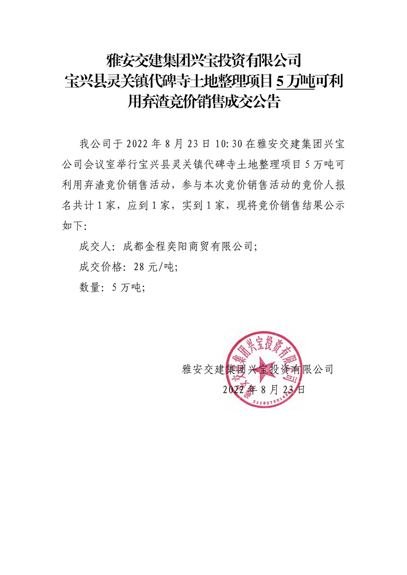 雅安交建集團(tuán)興寶投資有限公司寶興縣靈關(guān)鎮(zhèn)代碑寺土地整理項目5萬噸可利用棄渣競價銷售成交公告(8.23)
