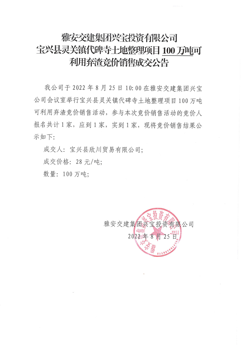 雅安交建集團(tuán)興寶投資有限公司寶興縣靈關(guān)鎮(zhèn)代碑寺土地整理項目5萬噸可利用棄渣競價銷售成交公告(8.23)