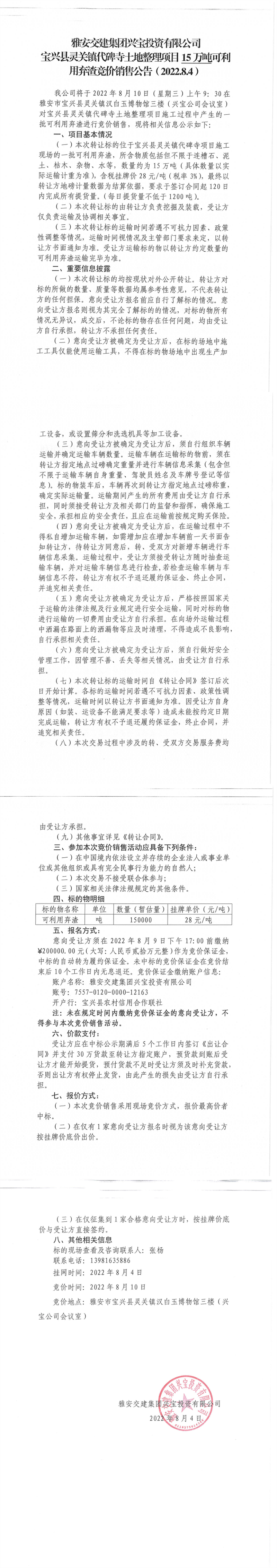 雅安交建集團興寶投資有限公司靈關鎮(zhèn)代碑寺土地整理項目15萬噸可利用棄渣競價銷售公告(2022.8.4)