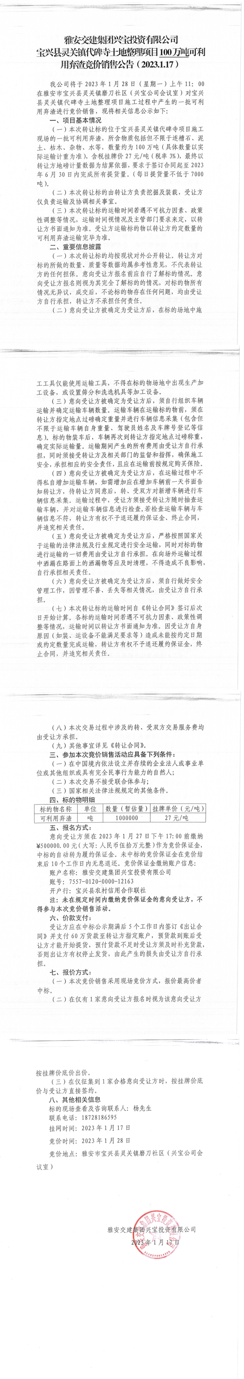 雅安交建集團(tuán)興寶投資有限公司100萬(wàn)噸可利用棄渣競(jìng)價(jià)銷(xiāo)售流標(biāo)公告(2023.1.16)
