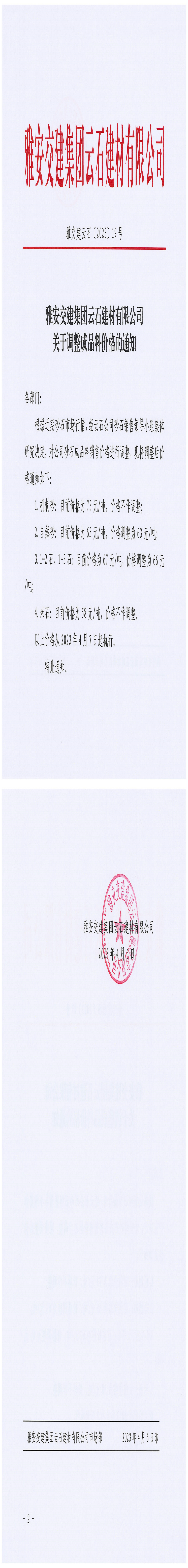 雅安交建集團(tuán)云石建材有限公司關(guān)于調(diào)整成品料價格的通知(2023-4-6)