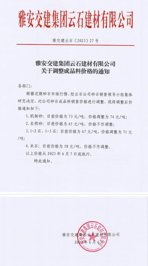 雅安交建集團(tuán)云石建材有限公司成品料價格調(diào)整公告(2023-06-06)